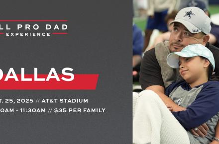 It starts when you and your child experience the thrill of stepping onto the field where the Dallas Cowboys play. You’ll spend the next few hours connecting with your kids with plenty of fun and interactive family moments, plus some practical fatherhood tips to put into practice. You won’t want to miss this memorable Dallas All Pro Dad Experience, created just for you and your kids!